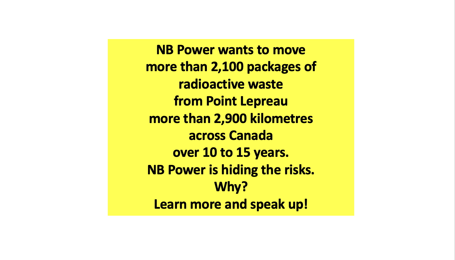 NB Power and nuclear industry partners want to build a high-level radioactive waste pit in Northwestern Ontario. But they are hiding the risks of transporting the waste more than 2,900 km from Point Lepreau through communities in New Brunswick, Quebec and Ontario, many times over many years.